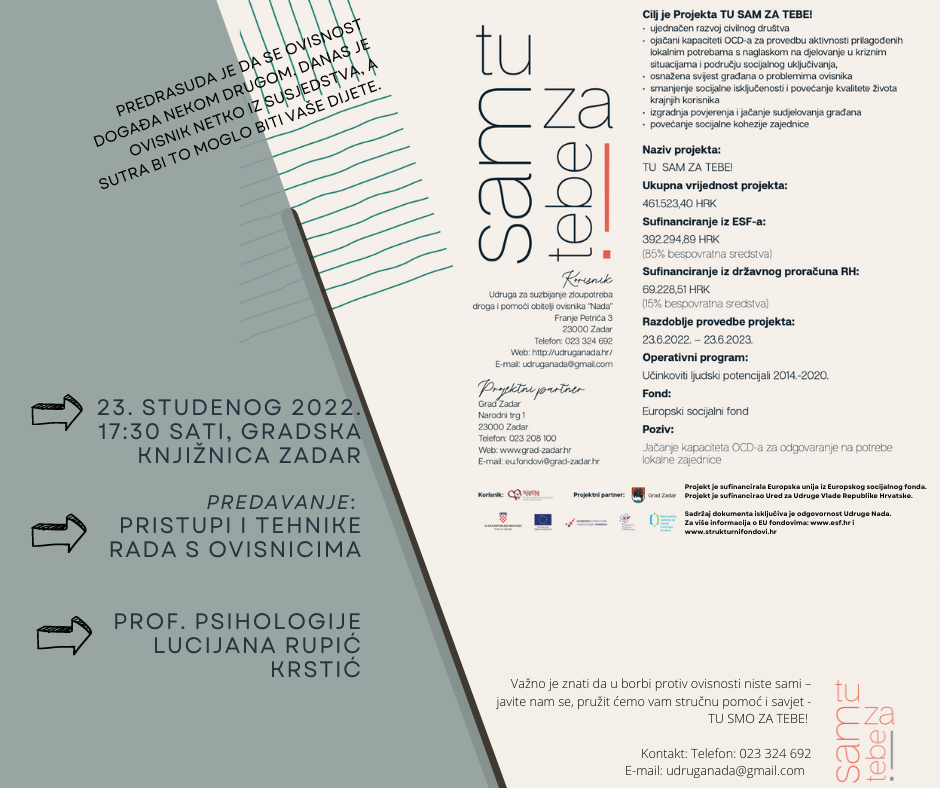 U Mjesecu borbe protiv ovisnosti (15.11. - 15.12.) Udruga za suzbijanje zlouporabe droga i pomoć obiteljima ovisnika „Nada“ i Grad Zadar nastavljaju s provedbom ciklusa edukacija pod nazivom ''Tu sam za tebe!'' te dana 23. studenoga 2022. godine, s početkom u 17:30 sati, u Multimedijalnoj dvorani Gradske knjižnice Zadar, organiziraju predavanje pod nazivom "Pristupi i tehnike rada s ovisnicima".