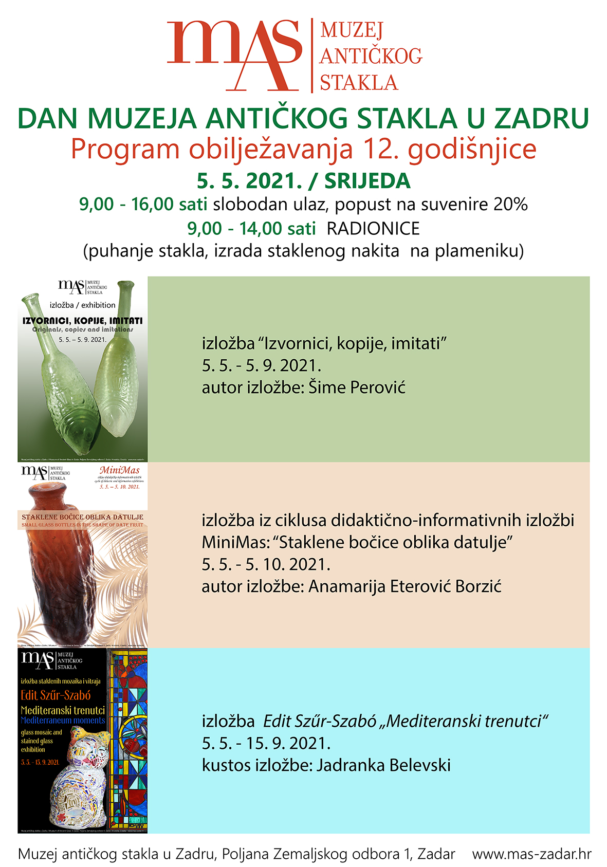 Dana 5. svibnja 2021. godine, u sklopu obilježavanja 12. godišnjice Muzeja antičkog stakla Zadar, bit će otvorene za javnost tri nove privremene izložbe.