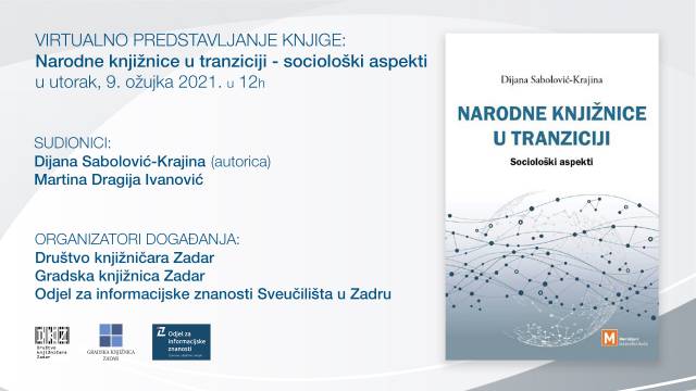 Virtualno predstavljanje knjige „Narodne knjižnice u tranziciji - sociološki aspekti“ održat će se u utorak, 9. ožujka 2021. u 12 sati.