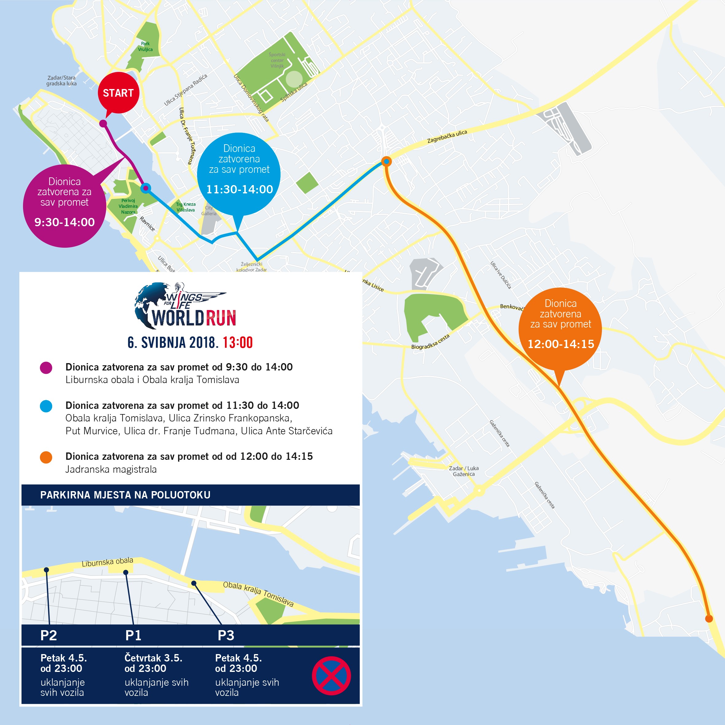 Na dan Wings for Life World Run utrke, u nedjelju 6. svibnja 2018., u Zadru će se odvijati posebna regulacija prometa. Informacije o zatvorenim prometnicama i vremenu tijekom kojeg će vrijediti posebna regulacija prometa pronađite u priloženoj karti.