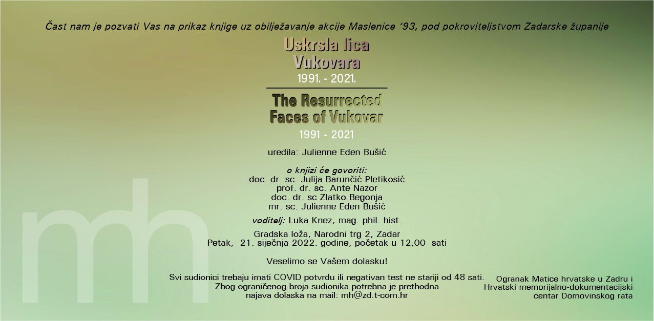 Pod pokroviteljstvom Zadarske županije, uz obilježavanje obljetnice akcije Maslenica 93, Ogranak Matice hrvatske u Zadru i Hrvatski memorijalno-dokumentacijski centar Domovinskog rata prikazuju dvojezičnu knjigu koju je uredila Julienne Eden Bušić: Uskrsla lica Vukovara 1991. – 2021. / The Resurrected Faces of Vukovar 1991 – 2021